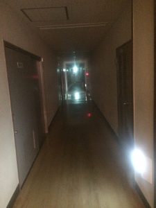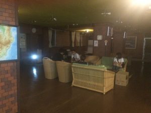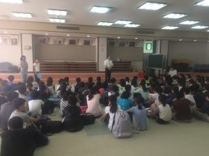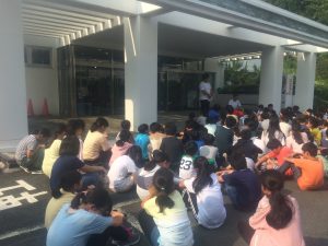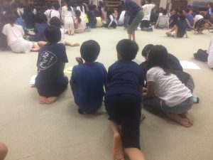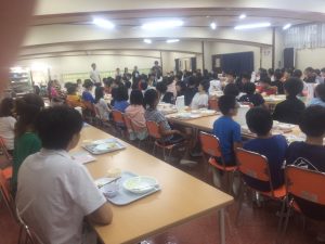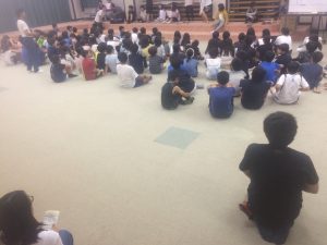 15時過ぎ宿舎の弓ヶ浜クラブに着きました。みんなとても元気です。開校式をし、避難訓練の後、お風呂となりました。 食事係が準備し、18時より夕食が始まりました。第1日目の夕食はカレーライス、アジフライ、キャベツのソテーサラダ、フルーツポンチです。ごちそうさま〜。たくさんおかわりもしました。19時からは室内レクが始まりました。レク係が準備してきたゲームを全員で楽しみました。あるグループの解答用紙です。行動班対抗です。なかなかのレベルの問題でした。9時半、消灯時間です。廊下はこんな感じですが・・・10時過ぎのロビーです。明日の元気な活動のため、子どもたちの安らかな睡眠を願いながら先生たちはこれから打ち合わせです。