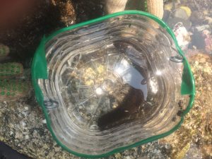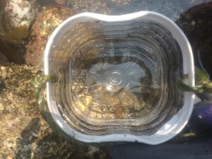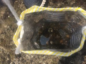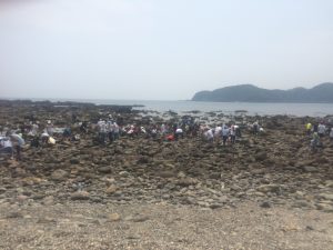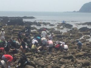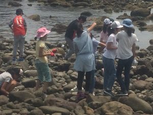 逢の浜で磯観察が始まりました。はじめはおっかなびっくりな子どもたちも徐々に大胆に採取していました。