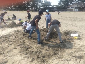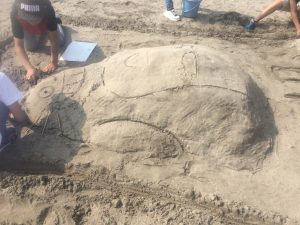 次に弓ヶ浜に移り、サンドアートを行いました。行動班であらかじめ学校で設計図を作ってきました。設計図を砂浜に置き、グループで協力しながら作りました。