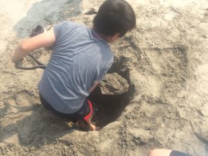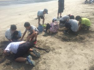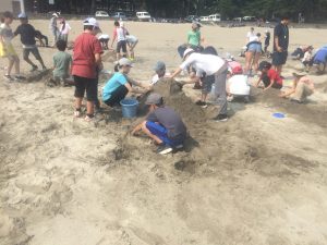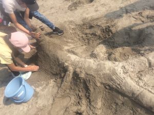 たっぷり1時間、みんなアート作りに没頭し、素晴らしい作品がたくさんできました。砂まみれになりながらも大満足の楽しい時間でした。16時前に弓ヶ浜クラブにもどりました。