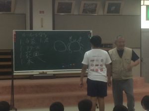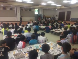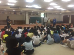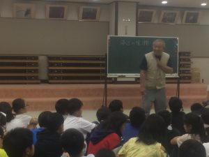 お昼にやる磯観察のレクチャーを漁師の大野さんから受けました。海辺の生き物の話を聞き、知識を得ました。