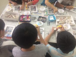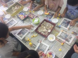 生活班でおしゃべりしながら貝や色とりどりの花びらを組み合わせ楽しんで作っています。