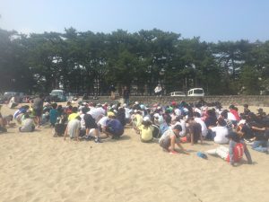 おはようございます。弓ヶ浜の朝は、まずまずのお天気です。朝、6時15分に起床、6時50分に玄関前に集合し、浜で朝会をしました。