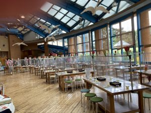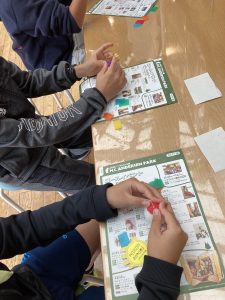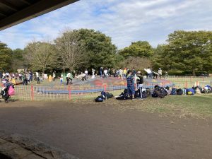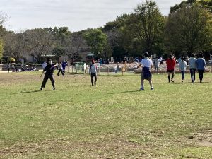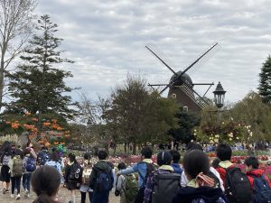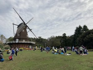 風車広場に移動し、集合写真を撮りお昼にしました。青空も見え出し少し寒いですがみんなで楽しく食べました。