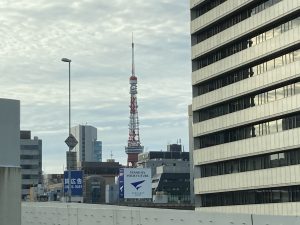 今、芝公園まで来ました。東京タワーが見えます。少し渋滞しています。今15時半です。