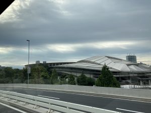 首都高に乗り東京体育館と新国立競技場の横を通り過ぎました。今、8時5分、渋滞もなく順調です。