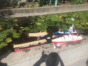 6年生が作った軍艦や警備艇の進水式を池でしました。夏の終わりのほっとする時間になりました。