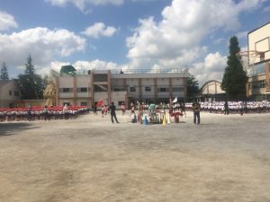 校庭での全校練習です。青空の下、子どもたちの元気な声か響きます。