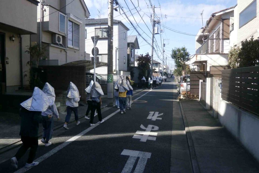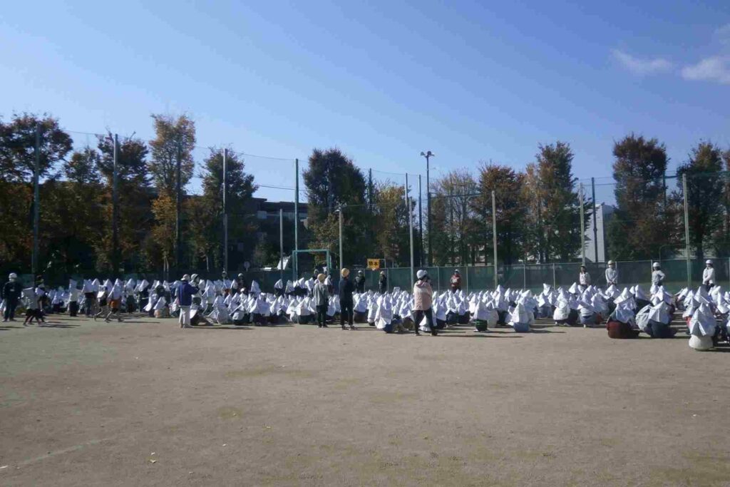 近隣の住宅が火災(大地震が伴う場合も含む)となり、火の強さ、風の強さ等により校舎、校庭にとどまることが難しいと判断される場合は、近隣施設への二次避難を行います。今日はその訓練で、一昨年、昨年に引き続き豊多摩高校さんのグラウンドをお借りして、全校児童(学年閉鎖中の6年生を除く)と全教員が訓練を行いました。