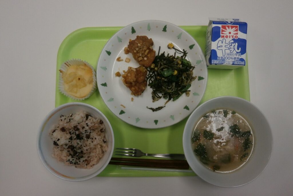 この日(10/27)はお祝い給食献立ということで、お赤飯がメニューに登場しています。この日の献立は、【お赤飯 沢煮わん とり唐揚げ南蛮ソース 小松菜ともやしの磯和え パインナップルケーキ 牛乳】と、なかなか豪華なラインナップです。