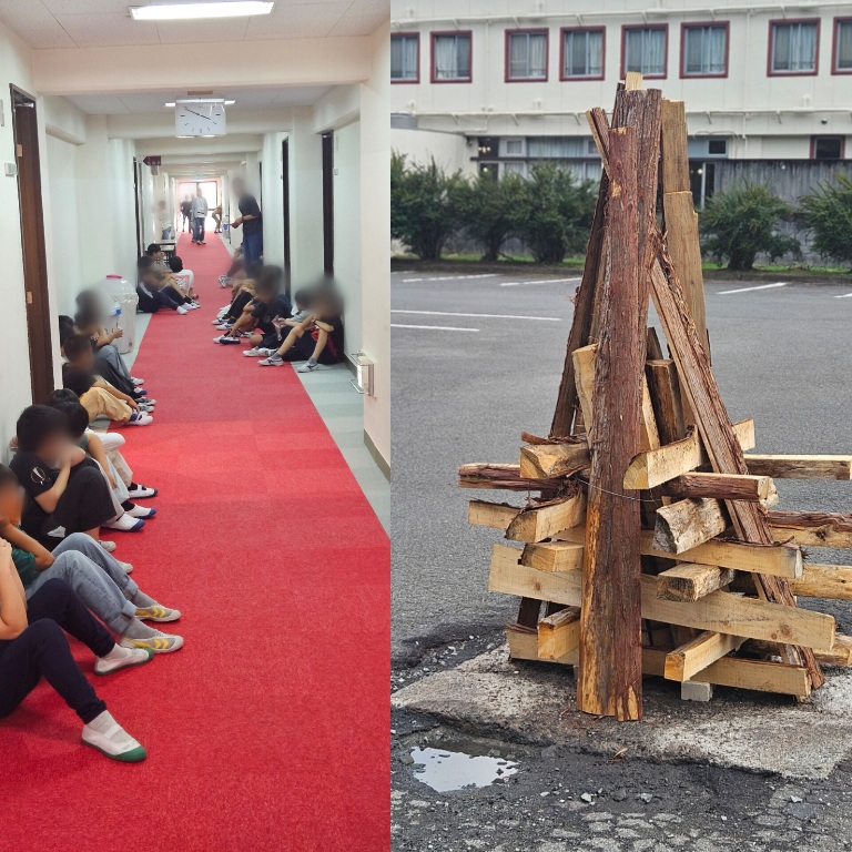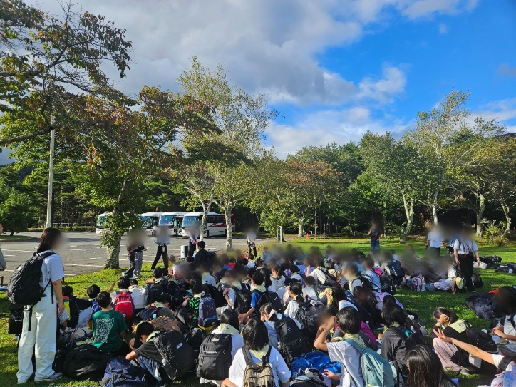(移動教室10/6⑨)宿舎に到着しました 開校式(画像1枚目)の空の様子を見ていただくとわかりますが、清々しい天候になっています。時折ぱらついたり☔、曇ったりしていますが、初日は上々の天気に恵まれました。酔った子、熱っぽい子、軽いケガをした子は数名いますが、全員元気に到着です。 入室後は避難訓練で非常口の確認と、キャンプファイヤー係の最終打ち合わせ。画像2枚目の右半分は、点火する前の薪です。目の前で見るとかなり大きいです🔥 画像4枚目は宿舎の後方に見えるはずの富士山🗻 今日は完全に雲がかかっていました。 コメントは受け付けていません。 (移動教室10/6⑧)森のさかな公園② (移動教室10/6⑩)部屋での生活