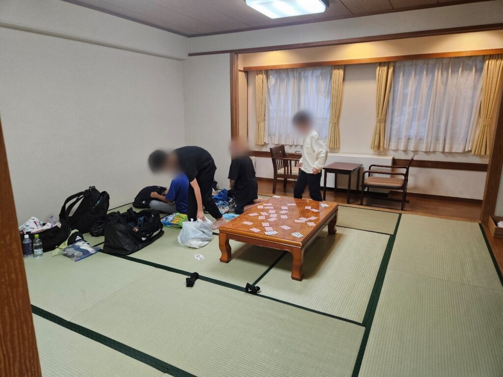 (移動教室10/6⑩)部屋での生活 「他の部屋探検」と称して廊下に出て走ったり騒いだりしている子を指導しながら、各部屋探訪。初日にして、既に上履き揃えている班や、カードゲームやおしゃべりに夢中な班などがあり、メンパーの雰囲気が部屋の様子に表れているようです。 ちなみに撮影時間帯としては17時前後ですが、既にお布団を敷いている班も多数あります。布団を敷く、シーツを取り付ける作業は多くの児童が悪戦苦闘していました。 コメントは受け付けていません。 (移動教室10/6⑨)宿舎に到着しました (移動教室10/6⑪)夕食タイム