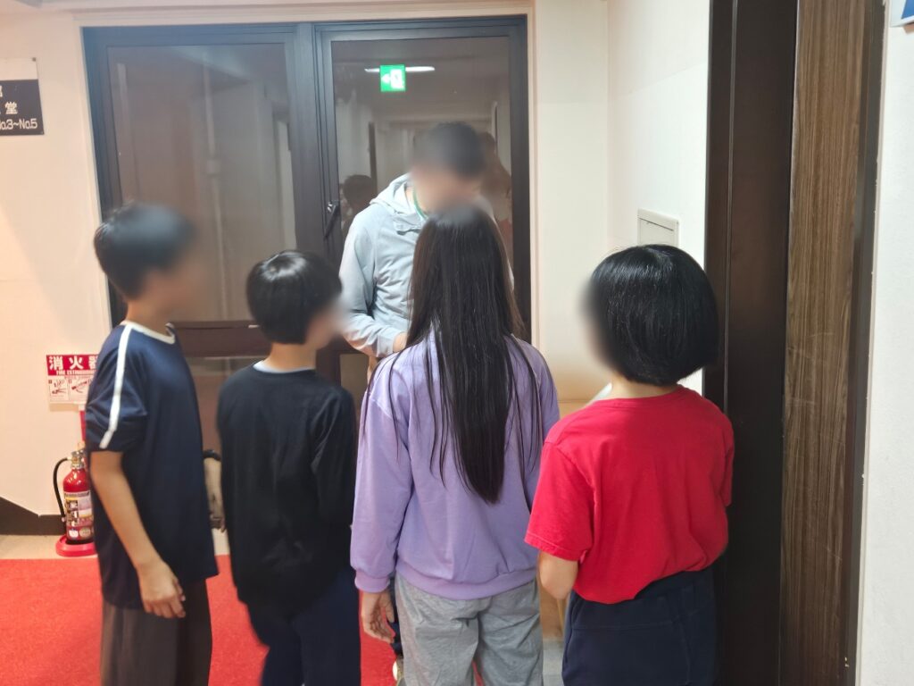 画像1枚目は保健係による健康カードの提出時の様子です。部屋のメンバーの検温結果を記載したカードを保健担当の先生あるいは看護師さんに見せて、健康チェックをします。ここでは、夕食後の薬の服用確認と同じように就寝前の服用確認も確実に行います。保護者の届け出書類どおりに服用しているかどうかの確認はとても大事で、引率教職員も細心の注意を払います。