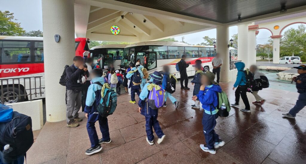 2日目午前の活動は精進湖トレッキング🚶🚶‍♀️ 出発時は霧雨だったので、バス会社様の計らいで玄関前に横付け(画像1枚目)をしていただき、スムーズに乗車することができました。
