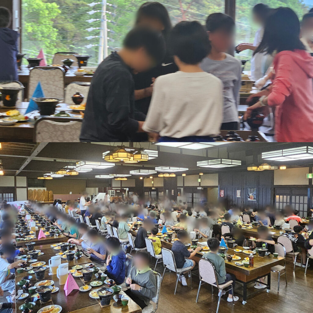 16時20分過ぎから学級ごとに入浴、18時10分に夕食というスケジュール。それぞれの係もしっかりと仕事をし、初日夕食の「いただきます」を迎えることができました。思えば、勾玉づくりをしていた14時前からあちこちで「腹減った~」という声が聞こえてきていました。ゆっくり食べる時間がとれないのが残念ですが、給食同様、安全で栄養のある、美味しい食事をいただきました。画像3枚目は、食事係さんの働く様子と、食堂の全体風景、4枚目は今夜の献立です。