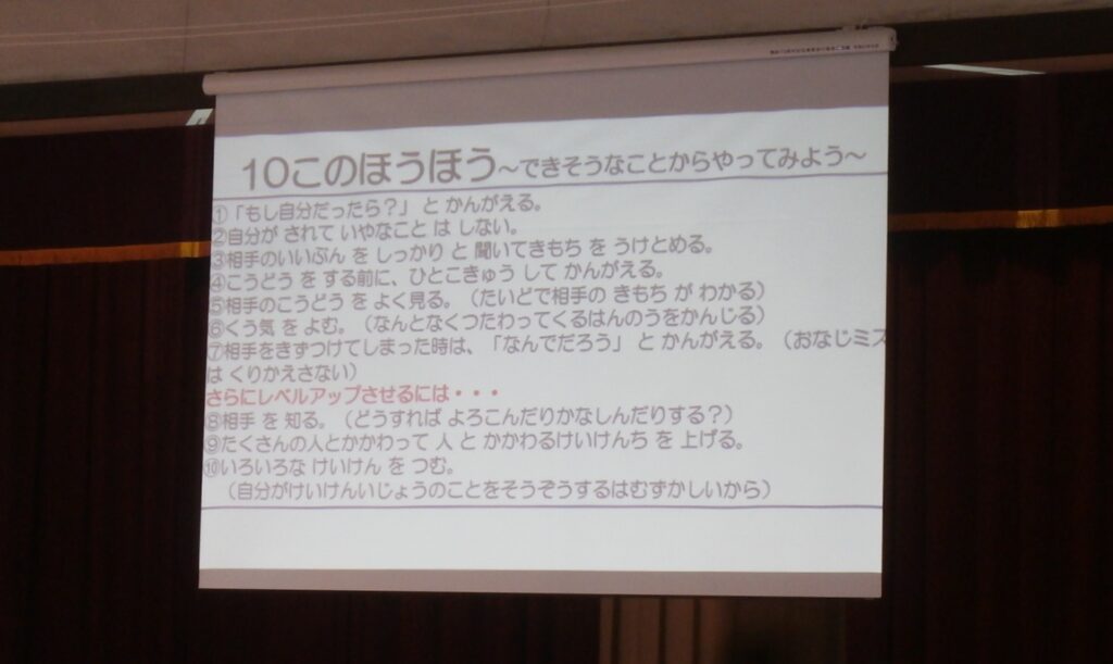その後引き続き週番の先生から今月の目標に関する話がありました。スクリーンに要点を映し出し、わかりやすく説明しています。【相手の気持ちを考える10の方法】(下の画像)は、どの学年の児童でもわかりやすい言葉を使用しています。その日からすぐに実践したいです。(画像は学校備品のオリンパス製校長用デジカメで撮影しています)