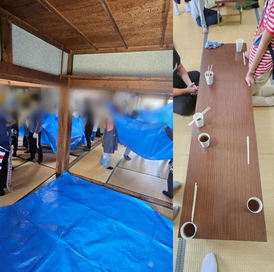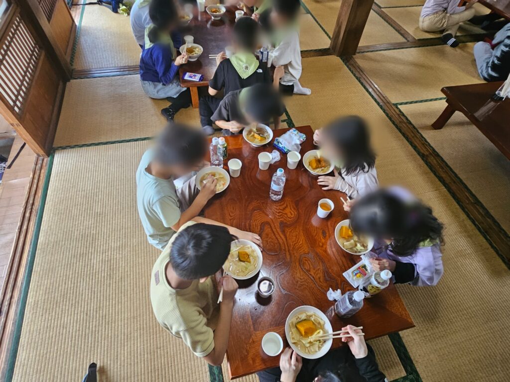 (10/7④)ゆで上がり待ち、そして完成 どの学級もケがなくトラブルなく、麺をこねる、切る作業が終わり、ゆで上がり待ちです。シ-トを畳んだりエプロン等を片付けたりしたあとは、協力してテーブル設定です。そんな中、待っている間に学級手作りほうとうができあがりました! 遅めの学級でも12時前には美味しい昼食時間となりました。 コメントは受け付けていません。 (10/7③)民宿に着きました (10/7⑤)河口湖フィールドセンター