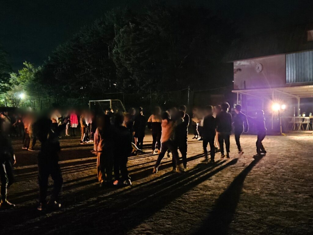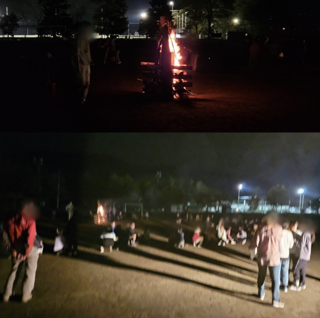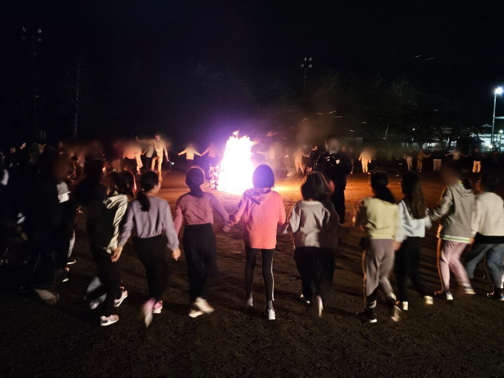 食後はキャンプファイヤー🔥(2枚目以降) 100万年前の時代から現れた『ヒノカミ』降臨のあと各クラスで決めた「○○の火」を中央に点火させ、会がスタートしました。各種ゲームで大盛り上がりのころ、空からポツポツと降雨が…。最後の方を切り上げて部屋に戻りました。富士山麓にみんなの声(雄叫び?)が響き渡った、楽しい夜になりました。