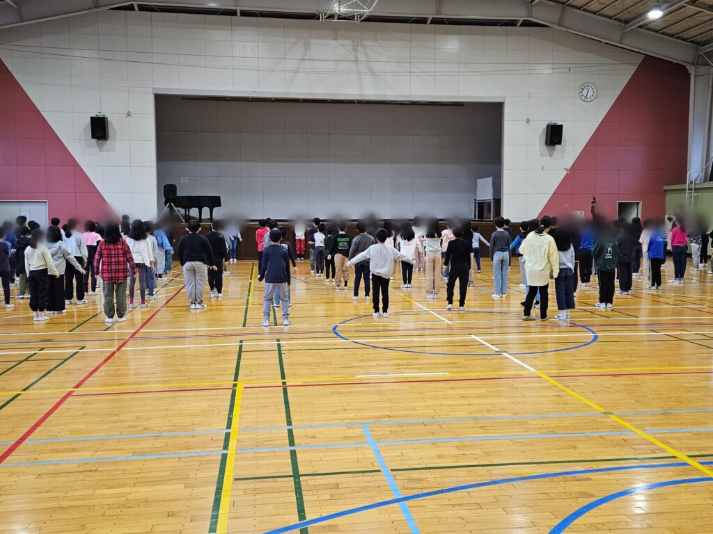 外で朝会ができないため、併設の体育館で行いました。画像1枚目を見るとわかりますが、朝会開始時刻の10分前に、すでにほとんどの班が集まっています。学校の全校朝会や児童集会でも5年生は集合がいつも早く、普段どおりの行動が移動教室でもできていることに感心しました! 予定が変更になる2日目となりますが、昨日よりも充実した団体生活ができそうな予感漂う朝でした。(2枚目は全員揃ってのラジオ体操です。)