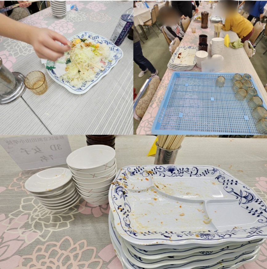 給食の片付け方とは違う、宿のルールがあり、調理していただいた方々への感謝の気持ちも込め、ご迷惑をかけない形での下膳の仕方も指導しています(4枚目)。野菜を中心に残飯も目立ちましたが、しっかり栄養補給できました。