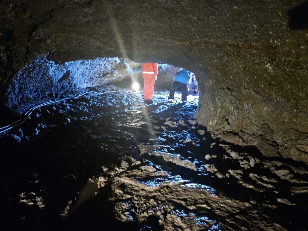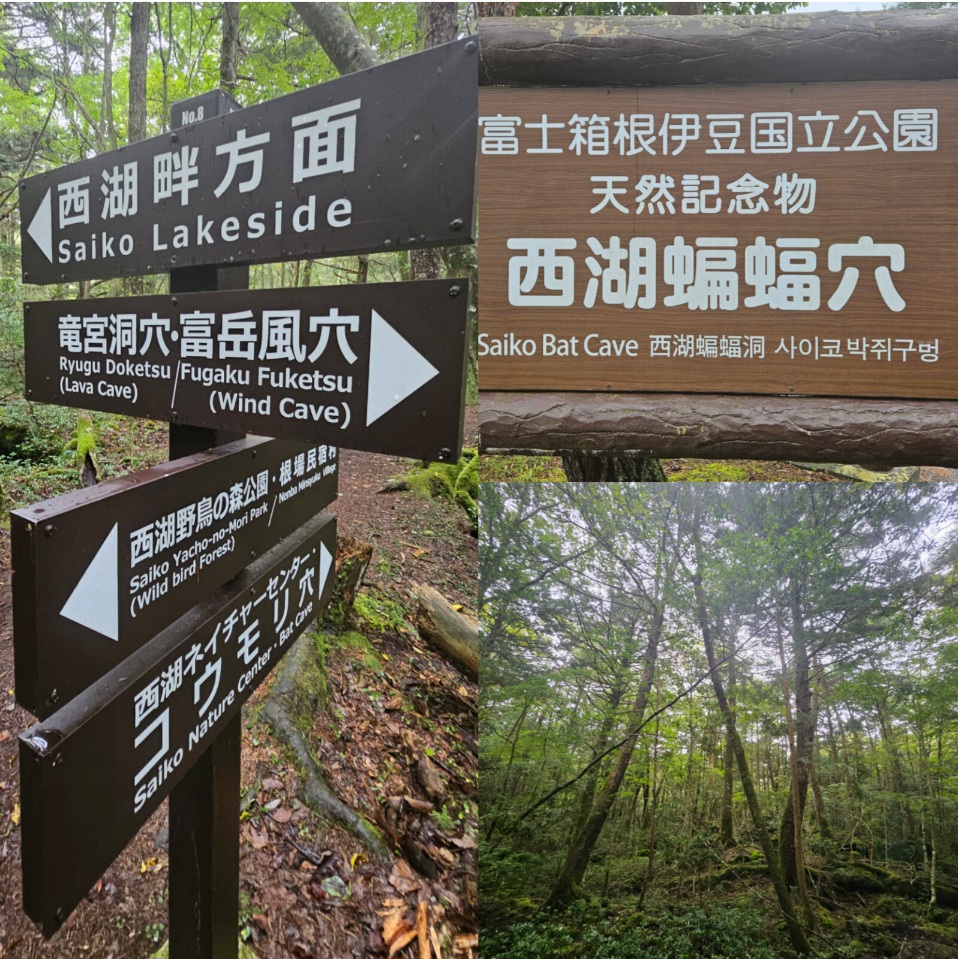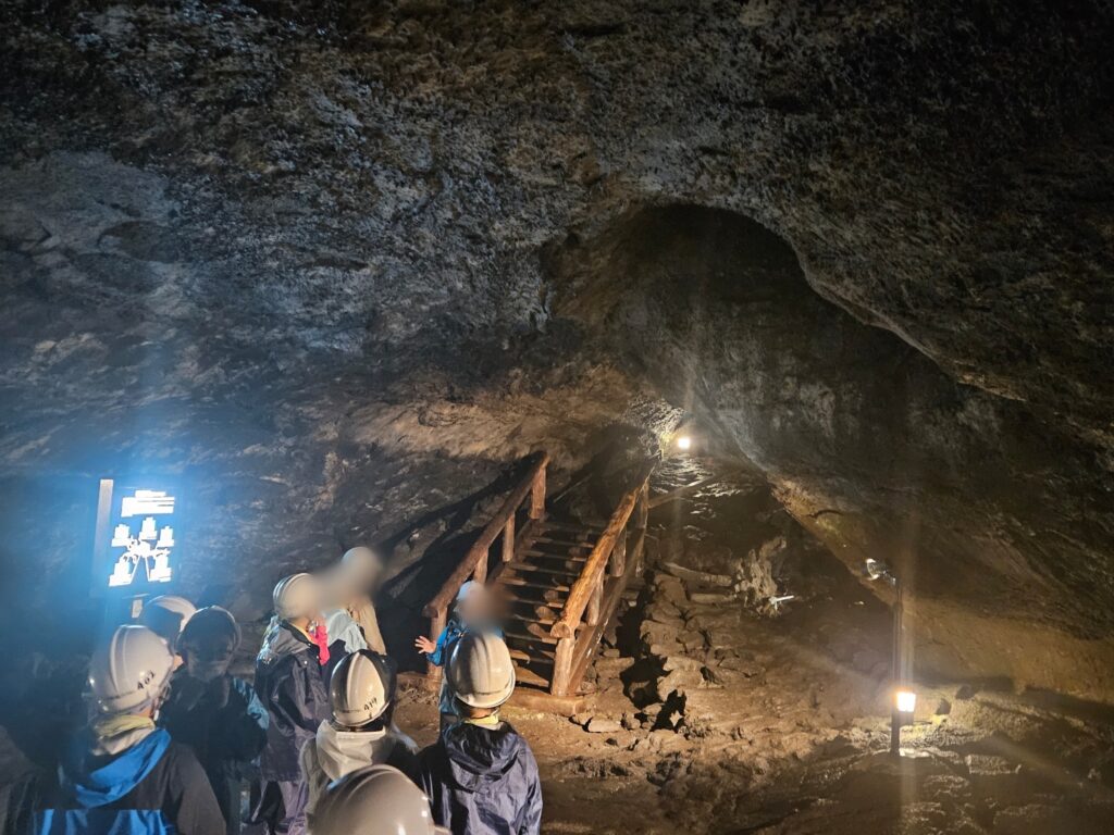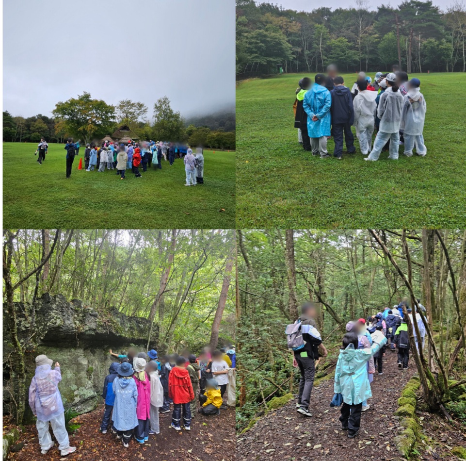 (10/8⑤)青木ケ原樹海散策その2 野鳥の森公園に着いた時はほとんど雨も上がっており(画像1枚目)、ずぶ濡れで困ったり身体が冷えたりすることはなく、むしろ少し蒸し暑い状態で散策スタートができました。クラスに2名、計8名の現地ガイドさんに説明をしていただきながら、樹海の散策を行いました。散策のゴールは、天然記念物にも指定されている『コウモリ穴』です。コウモリを保護するためのこの洞窟ですが、ヘルメット着用で実際に潜入しました。子どもの体格でも屈まないと前に進めないような狭い通路もあり(3枚目)、大人たちは苦労していました。 コメントは受け付けていません。 (10/8④)青木ケ原樹海散策その1 (10/8⑥)富士山世界遺産センター