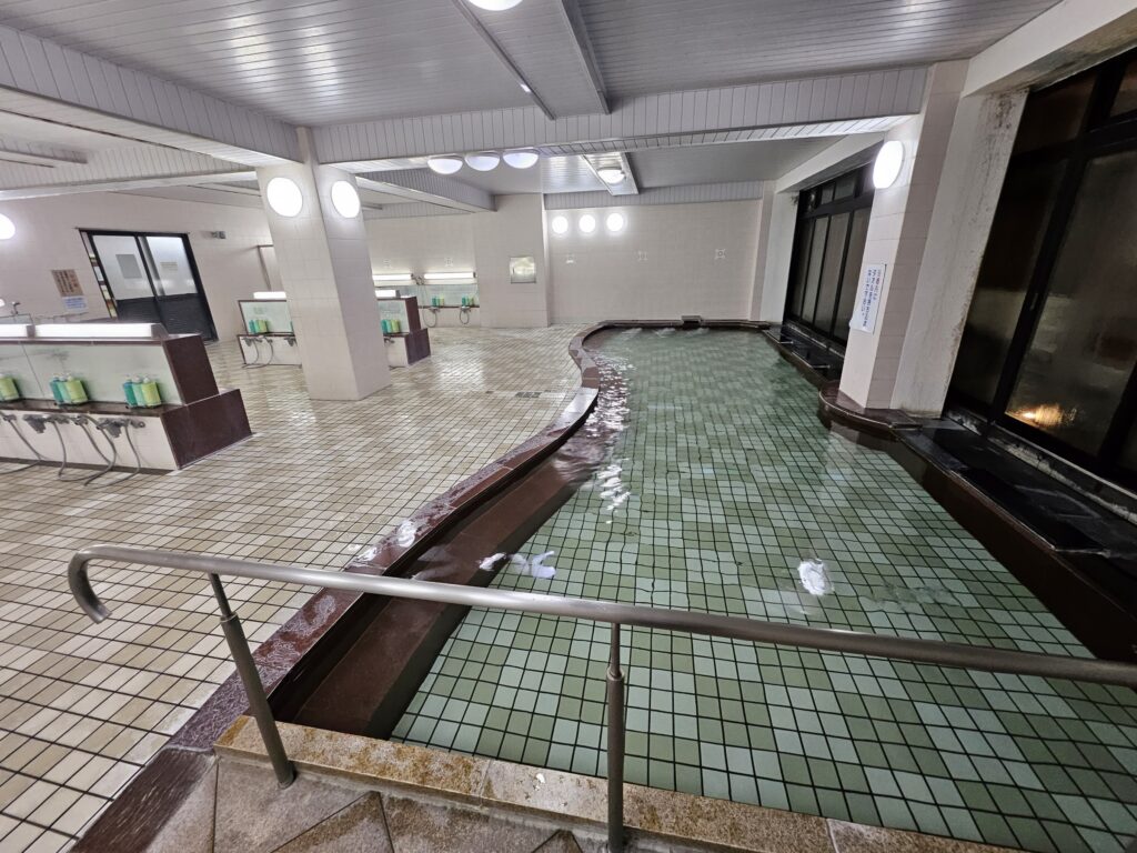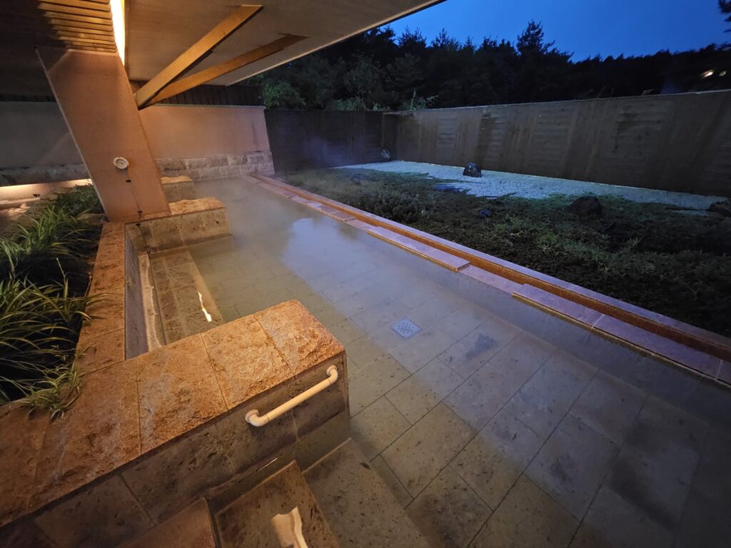 この後は夕食、体育館での室内レクという予定です。外は大雨。気温も低めです。明日の予定の心配もしつつ、最後の夜を楽しみます。画像2枚目以降はお風呂(男性用)の様子です。3枚目は露天風呂です。子どもなら20人くらいは一度に入れると思います。