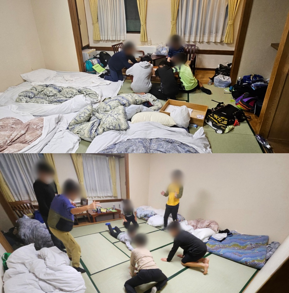 買い物のあとは入浴。一般のお客さんとの兼ね合いから入浴も時間が決められているので、浜小は17時までにお風呂から上がることになっています。食事は17時50分からですので、30分程度は「自由時間」となります。部屋でカードゲームに熱中している部屋、何やらわからない遊びを開発して楽しんでいる部屋など、それぞれの楽しみ方で過ごしていました。