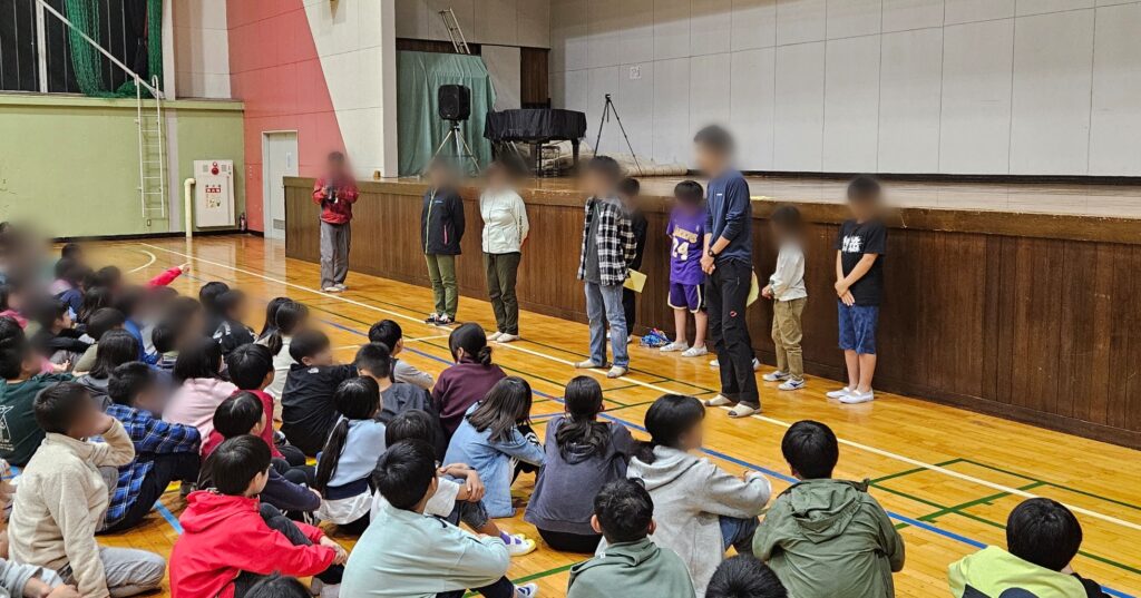 食後には、体育館での『館内レク』。昨日のキャンプファイヤーに続いてまたまたレク係さんの企画・運営による楽しい会になりました。最初の『先生クイズ』は、選択肢である先生たちがみんなの前に出て、リアルに選んでもらう、斬新な企画(2枚目)です。「じゃんけんに一番強い先生」「手押し相撲で一番強い先生」「二重跳びを一番長い時間跳べる先生」などを当ててもらうクイズで、実際に先生たちが競技して本物の勝者を決めます。