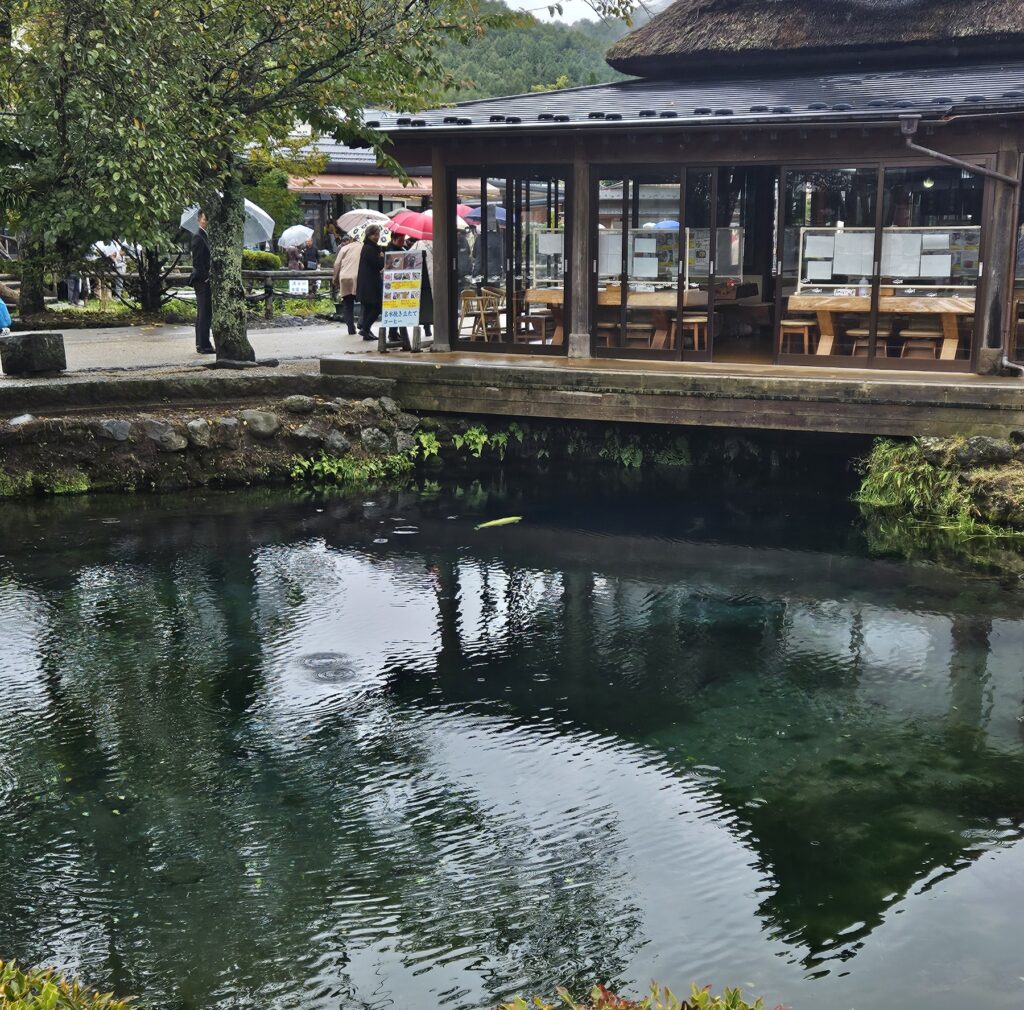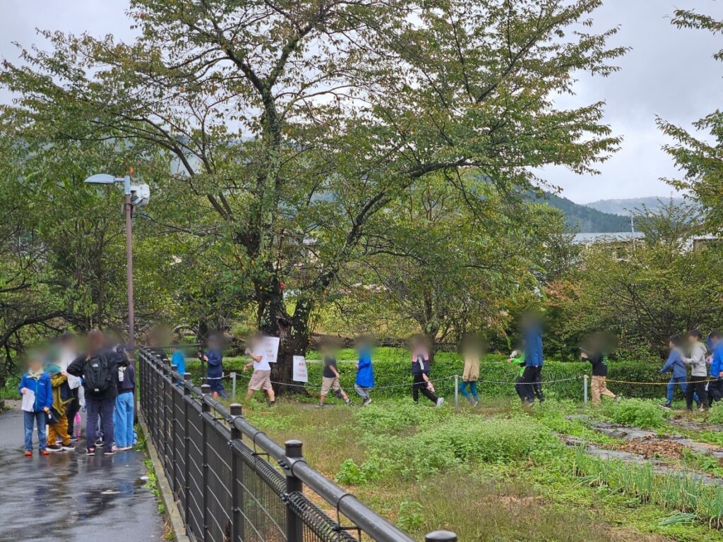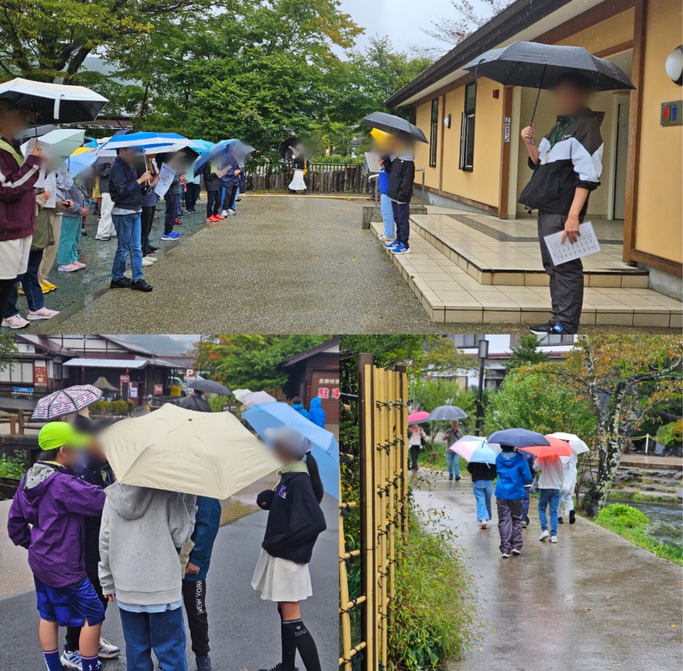 今日最初の活動場所は、1日目にほうとう作り体験をした民宿から程近い、忍野八海です。宿舎を出る時まではかなりの雨量でしたが、ここでのウォークラリーが終わる頃はほとんど傘を差さなくても大丈夫なくらい、小雨になってきました(画像3枚目)。