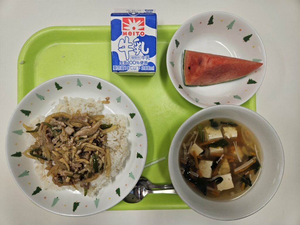 (6/3)給食に小玉すいか🍉が出ました 大玉のものより早めに市場に出回り、夏の暑さを感じ始める頃あたりが「旬」とされています。冷蔵庫が普及した昭和30年頃、当時はまだまだ小型だった冷蔵庫に合わせて、改良されてできたとも言われています。サイズは小さめですが、皮が薄く甘みが強いのが特徴です。今日もおいしくいただきました。(この日の献立:青椒肉絲丼 はるさめスープ 小玉すいか 牛乳) コメントは受け付けていません。 運動会後記② 運動会後記③