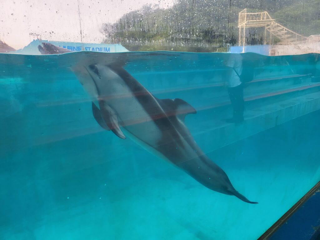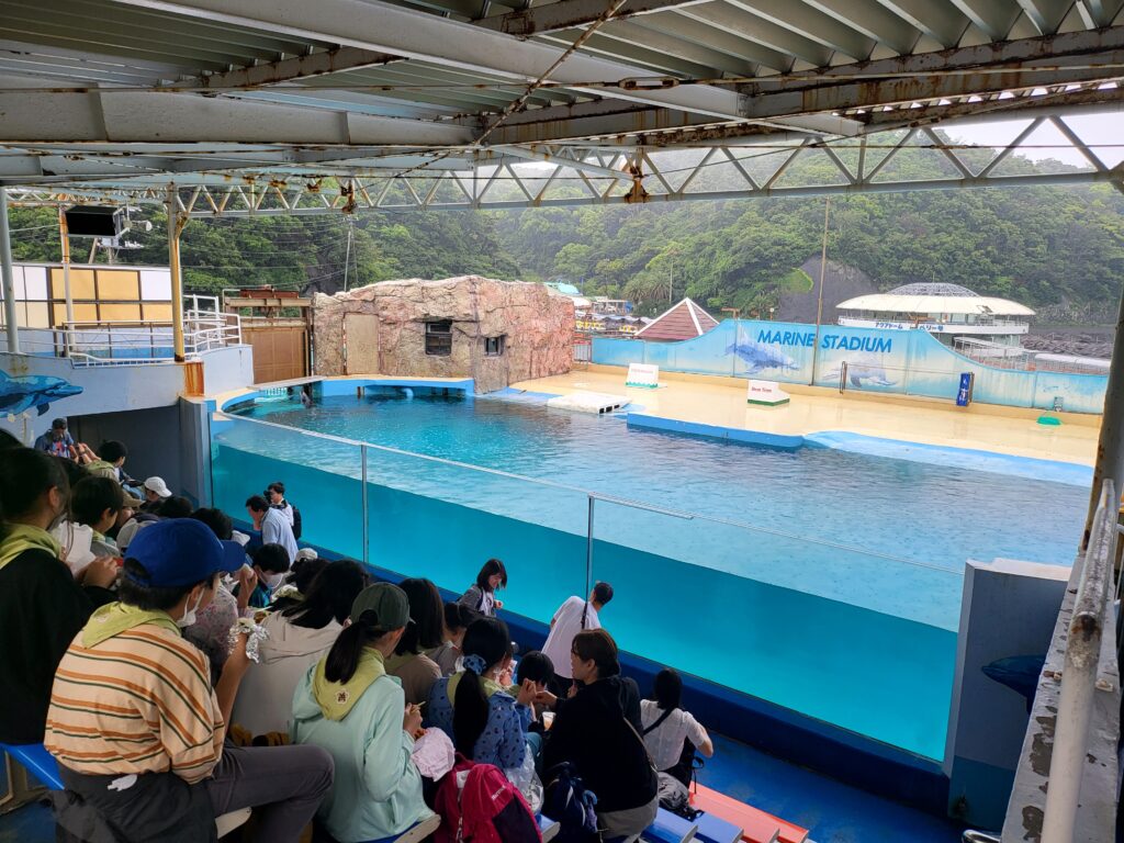 (6/12③)下田海中水族館に着きました 特にひどい酔い方をする児童もおらず、予定よりもかなり早く下田市、そして下田海中水族館に着きました。雨はけっこう降っていますが、屋根付きのマリンスタジアム🐬で少し早めの昼食をとっています。ショーの前ですが目の前の水槽にはイルカがすでにスタンバイしており、そちらが気になって先生の注意事項をあまり聞けてない児童もいました。 コメントは受け付けていません。 (6/12②)道の駅「天城越え」 (6/12④)雨が止みました