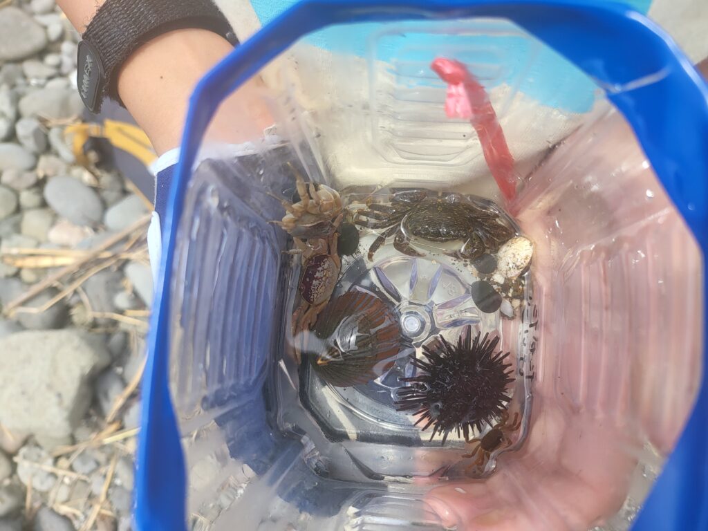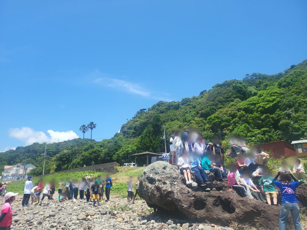 磯観察後にクラス写真を浜で撮り、宿舎に戻っての昼食。(ごめんなさい! お弁当🍱の撮影忘れました) 水筒の中身をしっかり補充して好天の中、午後の活動の場である下田市にバスで移動しています。