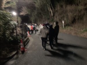 ナイトハイクに出かけました。みんなハイテンションです。暗い道、神社横を通り弓ヶ浜の浜辺に出て波音や校長の話を聞き宿舎に戻りました。