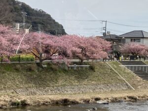 河津町に出ました。河津桜満開です。海も見えだしました。大島も見えます。