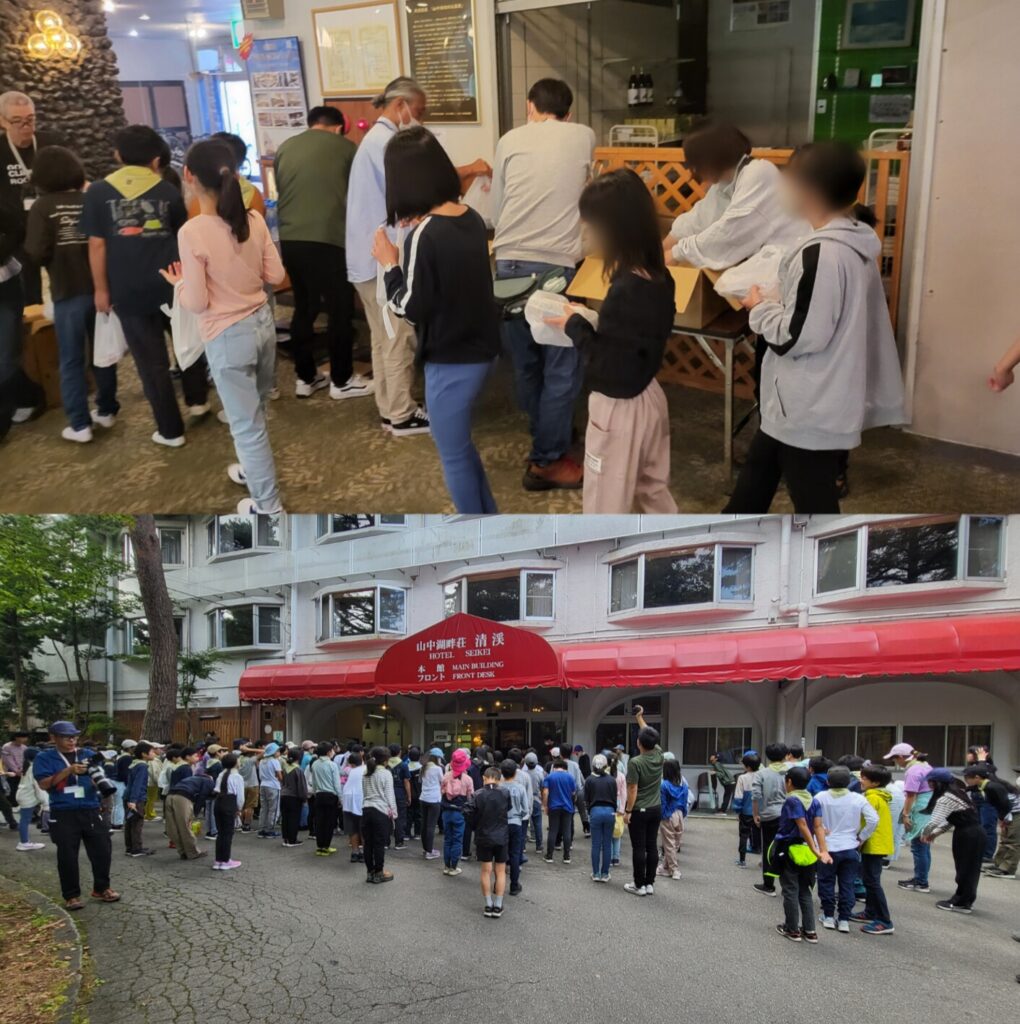 朝食後に今日の昼食とお茶を受け取り(写真1枚目上)、各自一斉に荷物整理。8時40分からの閉校式(写真1枚目下)をもって、二泊お世話になったホテル清渓さんとお別れすることになります。「感謝の気持ち」「来た時よりもきれいに」を合言葉に全員で寝具の片付け、清掃を行いました。