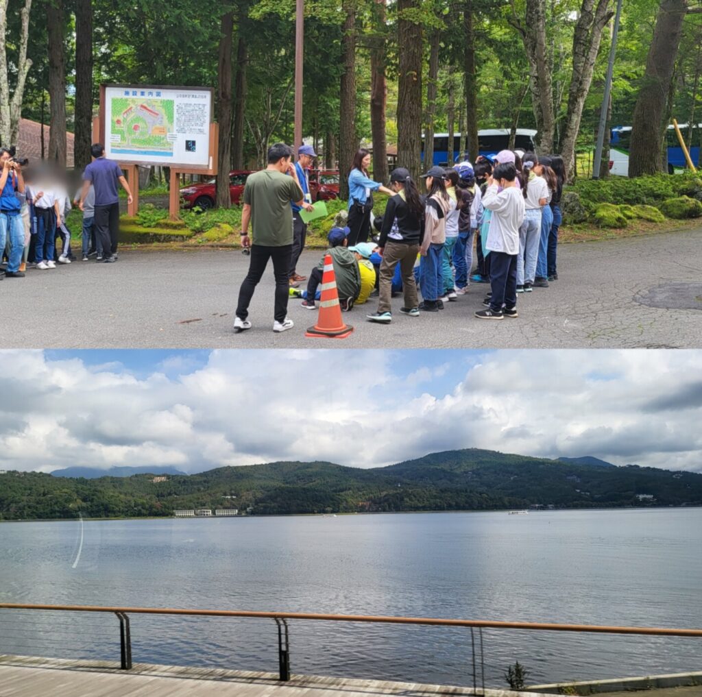 最後に宿舎前での記念撮影(写真2枚目上)。5学級あるとその分時間がかかります。思い出いっぱいの宿舎と山中湖(写真2枚目下)をあとにして、最後の活動地へ向かいます。