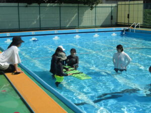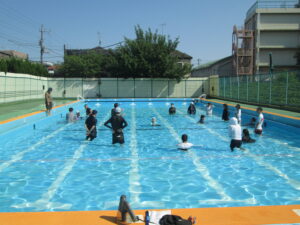 6月17日(月)から水泳学習が始まります。安全な水泳の学習ができるように、もしもの場合に備えて、教員が緊急時対応訓練を行いました。入泳中に緊急事態が発生した時の初期対応や役割分担、各係の行動、子どもたちの退避など一連の流れを確認しました。