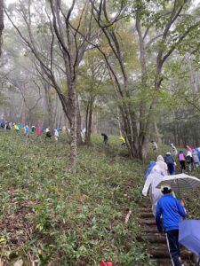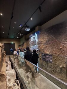 クラフト体験を終えて、実際に黒曜石が採掘された後を見学しに行きました。歩く頃は、雲の中にいるような雨が降りましたが、カッパを着て目標の『星くそ館』までたどり着きました。足元には普通に黒曜石が落ちていて、この地域はたくさんこの貴重な黒曜石を採れたことがわかります。持ち帰りたい気持ちもわかりますが、歴史は次の世代につないでいくことが大切です。館内で縄文時代の採掘の様子をプロジェクションマッピングで学びました。