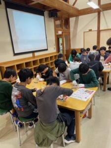 2日目の午前は蓼科・八ヶ岳総合自然学校で行動班に分かれてスコアオリエンテーリングを行いました。地図とコンパスを頼りにチェックポイントを回ってポイントを集めます。チェックポイントは森の中にたくさんあり、あちらこちらルートも複雑で、相談しながら進めます。早く回ってポイントを稼ぎたい子、疲れて歩くのがやっとな子、まとめようと頑張る子…いろいろですがたくさん声をかけあって、友達の気持ちを想像しながら楽しく歩き回っていました。