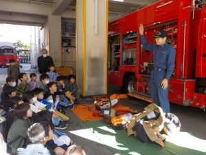 3年生は、社会科「火事から地いきの安全を守る」の学習で、荻窪消防署へ見学に行きました。早く火を消したり、けが人を助けたりするための工夫、隊員の皆様の努力についてお話いただきました。また、実際に60秒以内で防護服を着る様子を見せていただいたり、消防車両の見学もさせていただきました。子どもたちの質問にも丁寧にお答えいただき、より深い学習理解ができました。