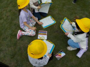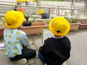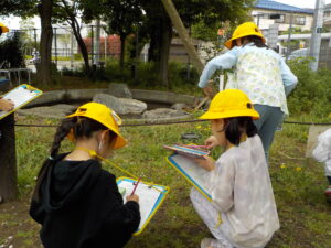 4月下旬、校庭で春の生き物探しを行いました。初めて「探検ボード」を持って、花壇の周りや遊具の裏、池の周りなどを見て回りました。思い思いの場所で活動し、たくさんの春の生き物を見付け、色鉛筆で描いていました。「池の中に魚がいる」や「こっちにナメクジがいた」とすてきな発見をしている子どもたちが印象的でした。