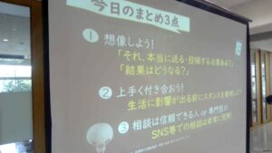 ぜひ、ご家庭でお子様にSNS安全教室の話題をだしていただき、上手にSNSと付き合っていくこと・ご家庭でのルールについて話していただければと思います。