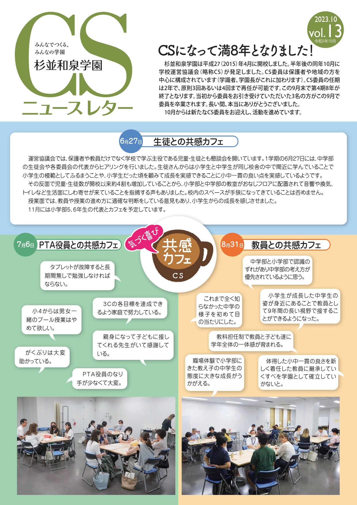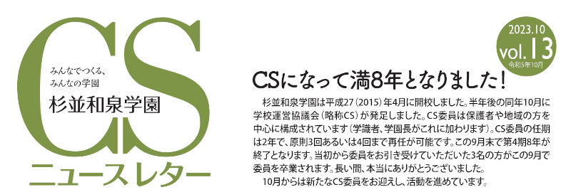 杉並和泉学園は平成27(2015)年4月に開校しました。半年後の同年10月に学校運営協議会(略称CS)が発足しました。
