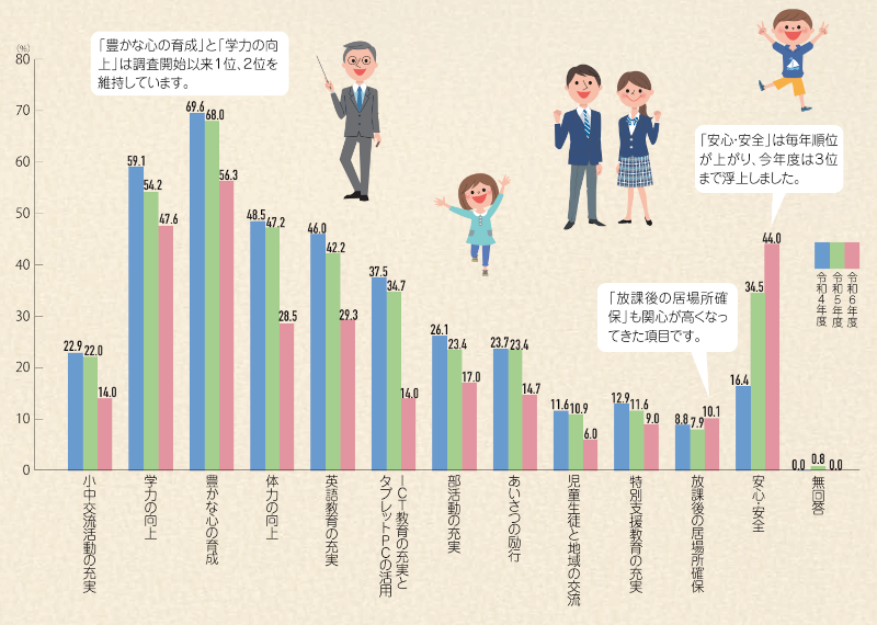 アンケートの最後の設問では 保護者の皆さんに今後の杉並和泉学園に期待する項目を3つ以内で選んでいただきました。