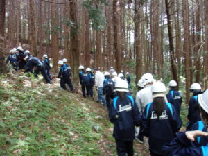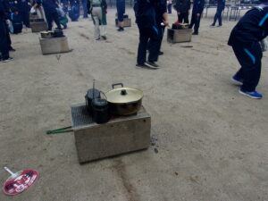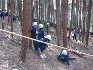 朝日里山学校で開講式を行った後は、予定通りに、飯盒炊さんと林業体験を行いました。