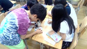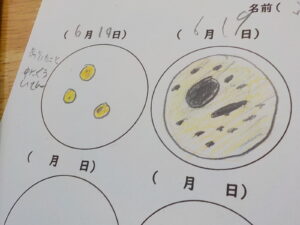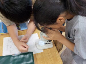 5月から飼いはじめ、みんなで世話をしているメダカからはなかなか卵が生まれなかったのですが、地域のメダカ屋さんから「一人でも多くの子供がメダカに興味を持ってくれるなら」と卵を40個以上も譲り受けることができました。児童はメダカ屋さんに感謝をしながら、卵を顕微鏡で観察しました。「目が見えるよ!」「毛が生えてるね。」など、どの子も興味津々。様々な発見をしながら、ワークシートに記録していました。