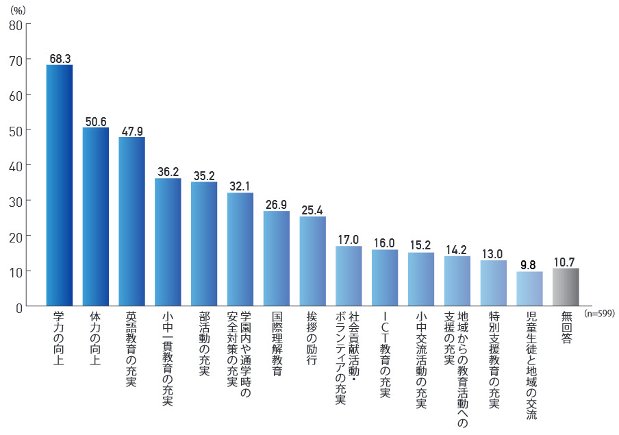 上位5位までの項目は前回と同じでした。とくに、上位の3項目、学力、体力そして英語教育の充実は保護者のみなさんにとって、学校教育に期待する最も切実な項目であることを再確認しました。