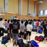 7時の集合よりも早めに登校してきた6年生。小アリーナで出発式を行いました。