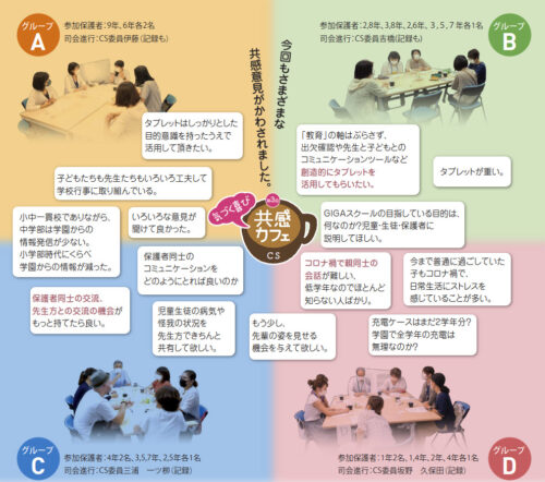コロナ禍ということで、昨年に引き続き、保護者の方とCS委員のみの4つの小グループでゆっくりと話し合う場にしました。