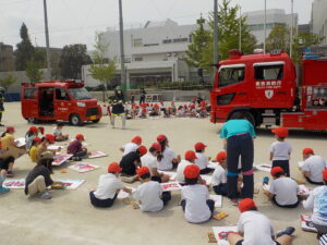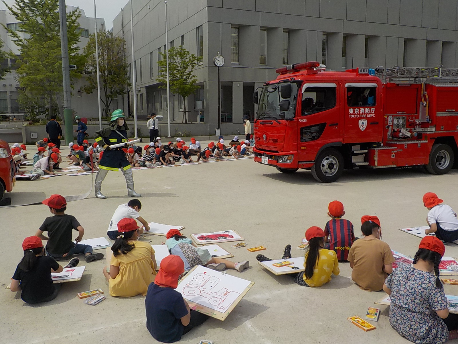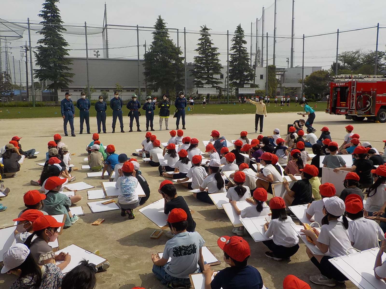 5月6日(金)の1、2校時に消防写生会を行いました。子供たちは間近で見る消防車の迫力に大喜びしていました。「タイヤは、こぶし一個分ぐらいの大きさになるように消防車をよく見て、大きく描こう。」を合言葉に、白い画用紙いっぱいに大きく、細かい部分まで丁寧に消防車を描くことができました。